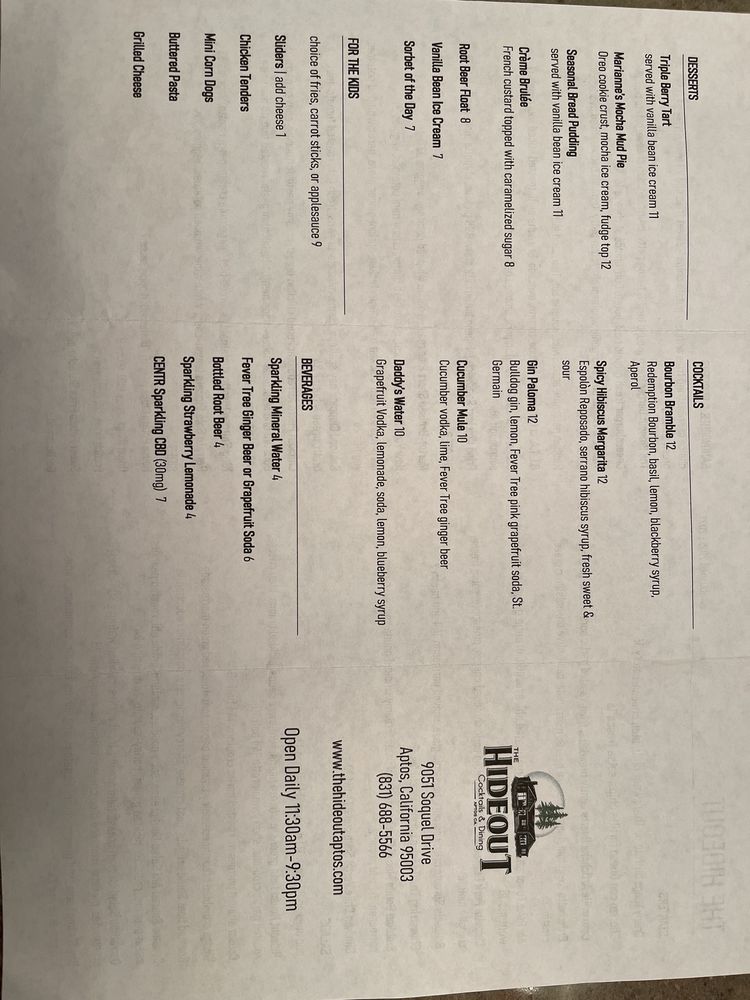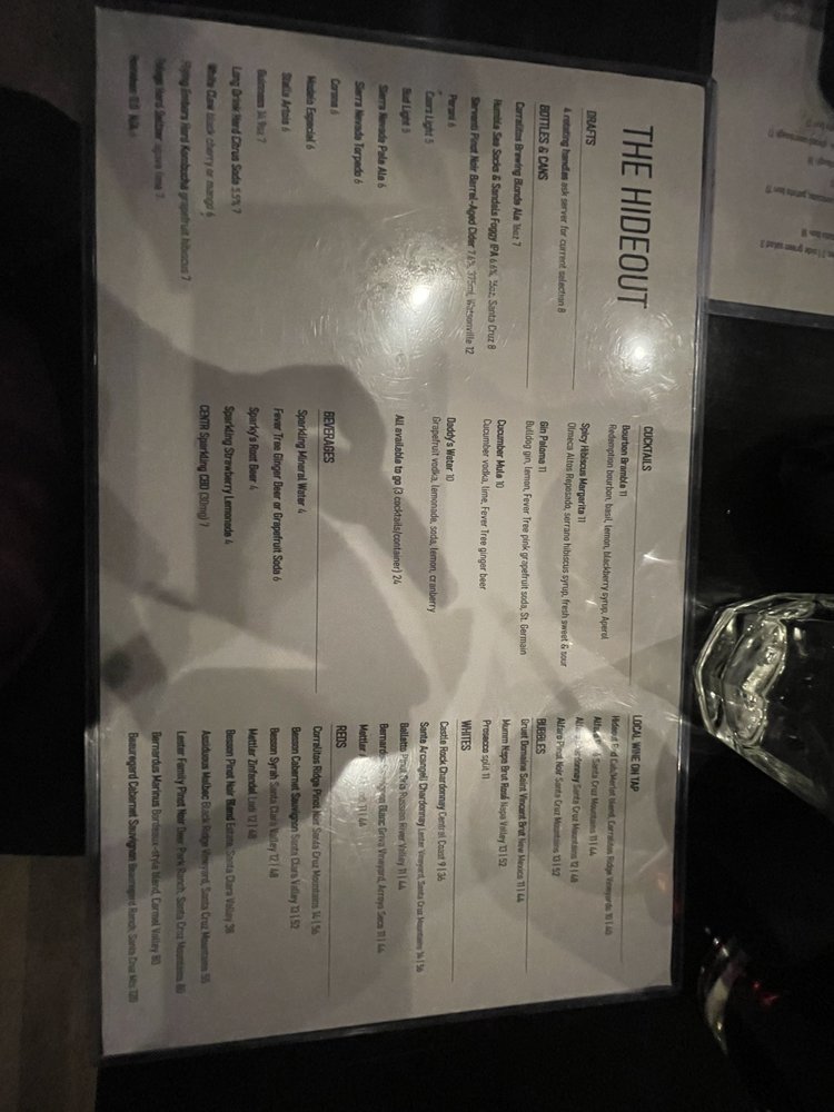 Introducing The Hideout, a hidden gem in Aptos offering a cozy atmosphere and delightful American cuisine with a focus on sandwiches and cocktails. Located at 9051 Soquel Dr Ste K, this restaurant provides a wide range of amenities such as outdoor seating, wheelchair accessibility, and full bar service. Customers rave about the friendly staff, ample portions, and a menu filled with vegetarian options. Notable dishes include the Ahi Tuna appetizer, Seared Ahi Salad, and Seafood Cioppino, all praised for their fresh ingredients and flavorful combinations. The Oreo bread pudding is a must-try for dessert enthusiasts. With its welcoming ambiance and diverse menu, The Hideout is a perfect spot for families, friends, and solo diners alike. Don't miss out on their happy hour specials and pool table for added entertainment.